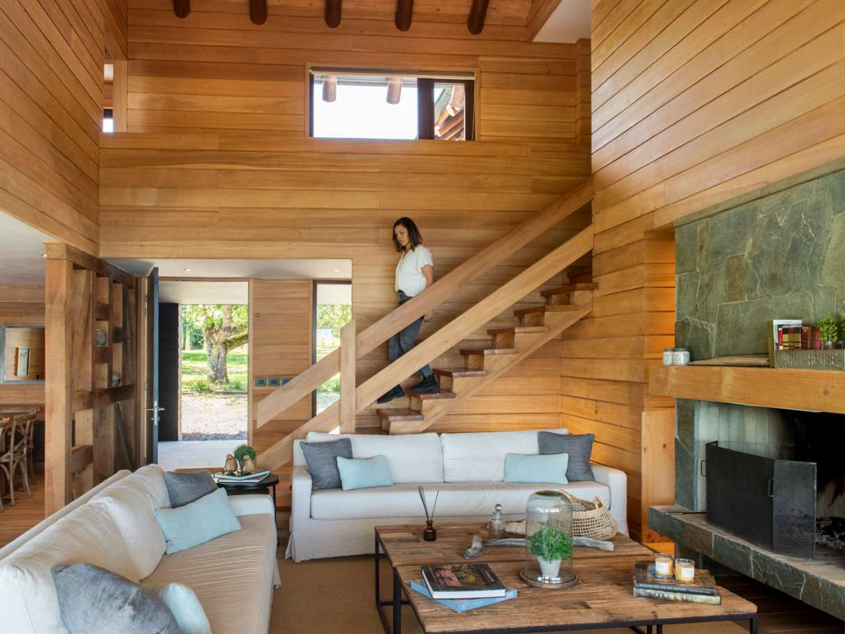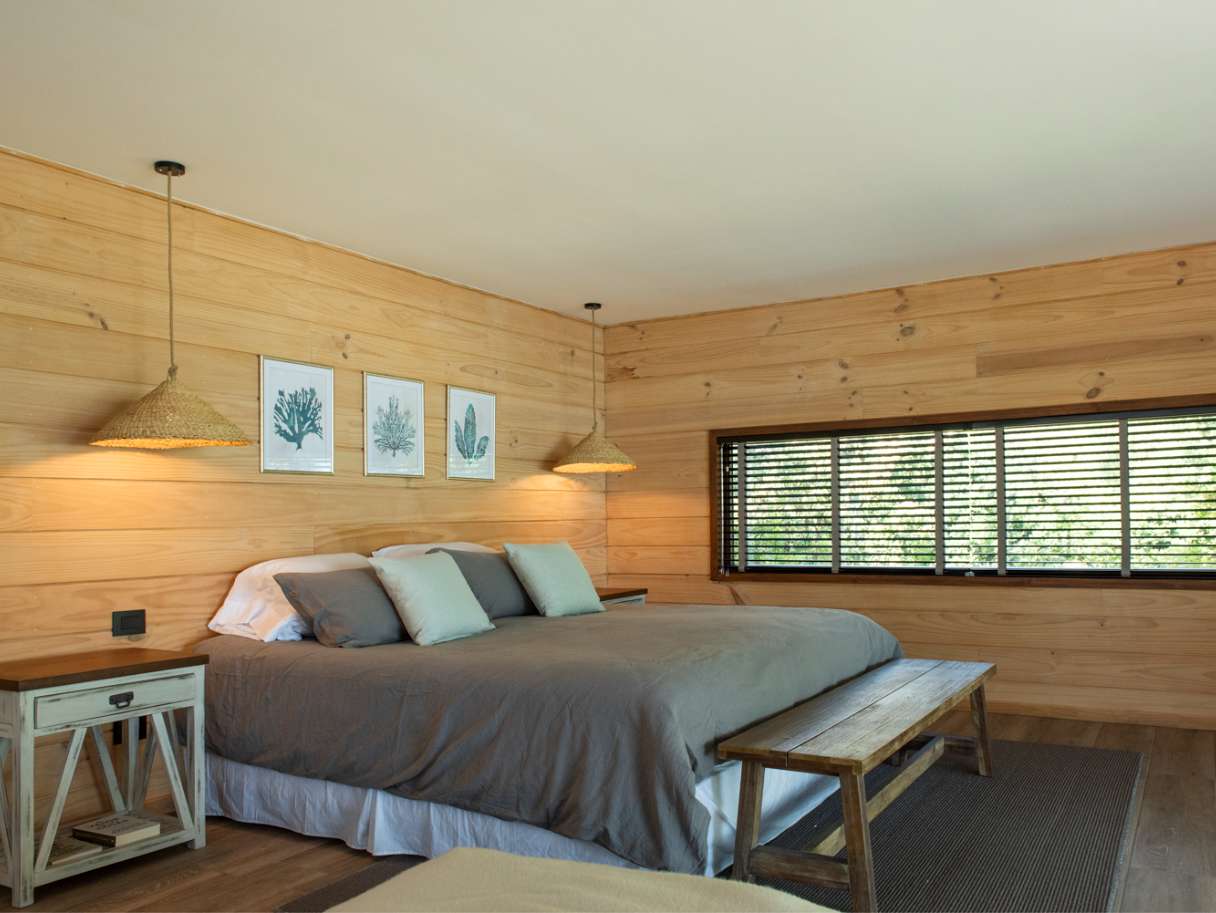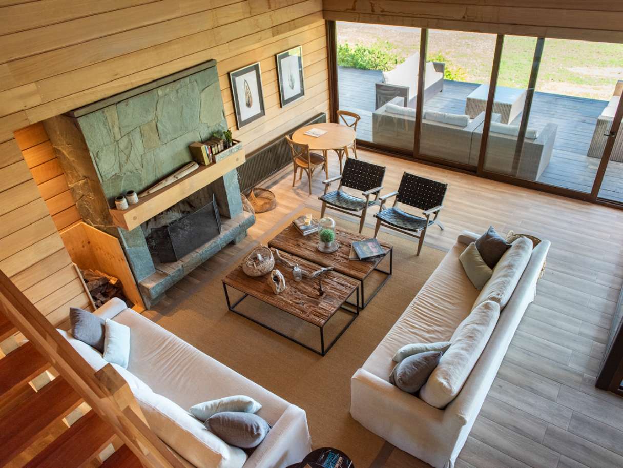 Materiales utilizados: • Madera de planes de manejo aprobados por Conaf • Revestimiento de madera de pino IPV • Piedra en muros clave • Cubierta de tejuela asfáltica reforzada, ideal para resistir los fuertes vientos de la zona